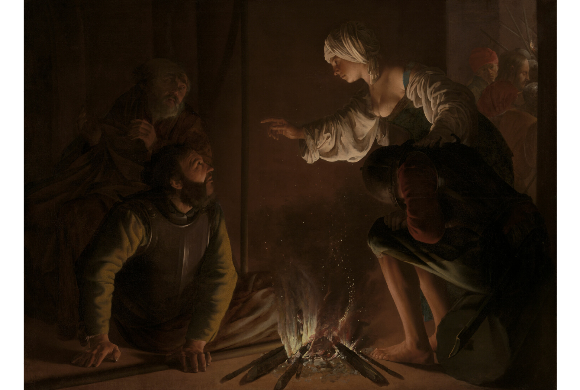 For this depiction of Peter denying that he is a follower of Jesus (seen under arrest in the background at right), Utrecht artist Hendrick ter Brugghen embraced the strong contrast of light and shadow and emotional urgency popularized by Italian painter Caravaggio. The dancing sparks of the fire illuminate the servant’s condemnatory finger and shroud the fearful saint in shadow, underlining the Dutch taste for naturalistic treatments of lighting in the 17th century.
